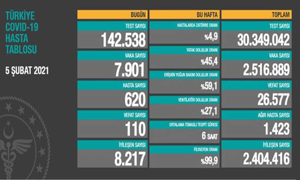 Sağlık Bakanlığı Türkiye Günlük Koronavirüs Tablosu’nu paylaştı. Türkiye'de Koronavirüs nedeniyle 110 kişi daha hayatını kaybetti, 620 yeni hasta dahil olmak üzere 7 bin 901 yeni 'vaka' tespit edildi. Böylece toplam ölüm sayısı 26 bin 577'ye, vaka sayısı ise 2 milyon 516 bin 889'a yükseldi.