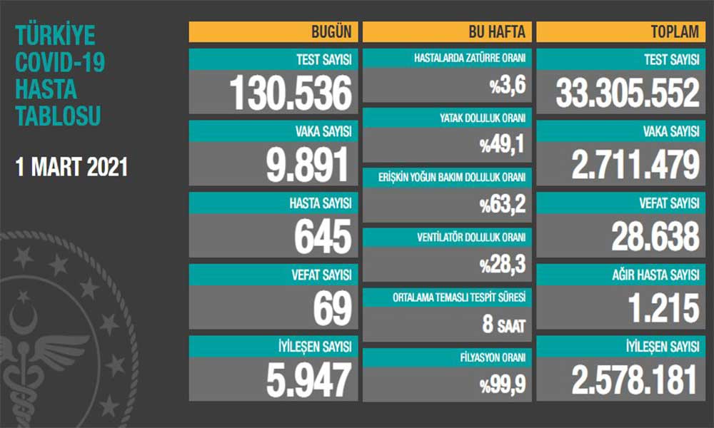 Sağlık Bakanlığı, Türkiye günlük koronavirüs tablosunu paylaştı. Bakanlığın açıkladığı verilere göre, Türkiye'de Koronavirüs nedeniyle 69 kişi daha hayatını kaybetti, 645 yeni hasta dahil olmak üzere 9 bin 891 yeni 'vaka' tespit edildi.