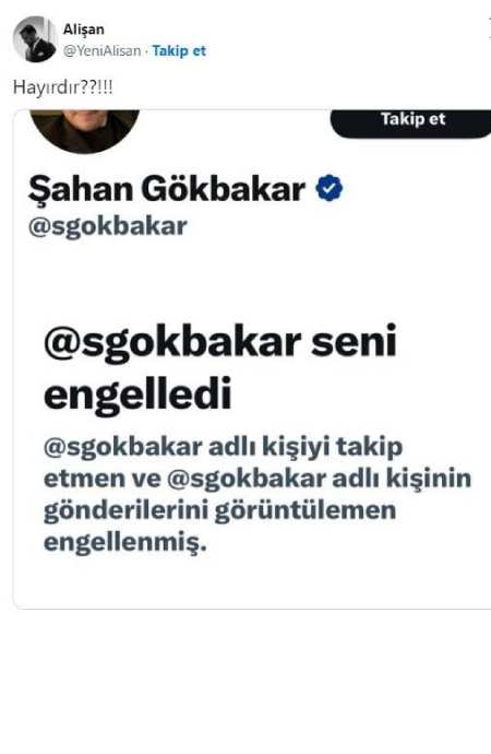 Yaptığı paylaşımlarla sık sık gündeme gelen Şahan Gökbakar, sosyal medya hesabından Alişan’ı engelledi. Durumu fark eden Alişan aldığı ekran görüntüsünü paylaşıp “Hayırdır?” notunu düştü.