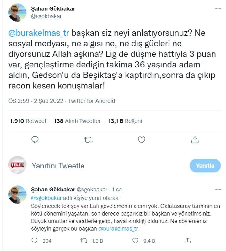 Galatasaray tutkunluğuyla bilinen oyuncu Şahan Gökbakar, Twitter hesabından yine Galatasaray Başkanı Burak Elmas'ı eleştirdi. Elmas'ı Galatasaray'a tarihinin 'en kötü dönemini yaşatan başkan' olarak nitelendiren Gökbakar, şunları yazdı: