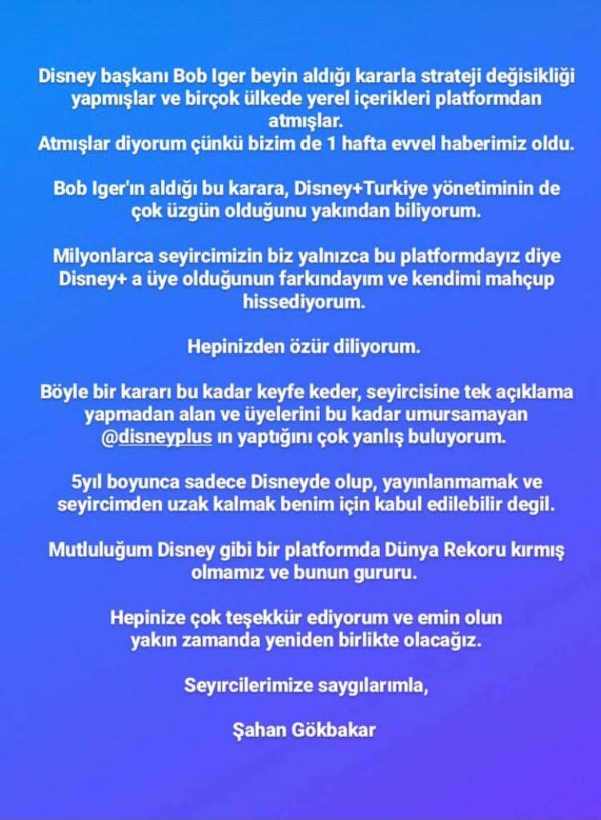 Disney Plus'ın yerli içerikleri kaldırmasının ardından Şahan Gökbakar, sosyal medya hesabından bir açıklama paylaştı. Milyonlarca seyircinin kendi filmi için üye olduğunu ve bu yüzden mahcup olduğunu ifade eden Gökbakar, "Hepinizden özür diliyorum. Böyle bir kararı çok yanlış buluyorum" dedi.