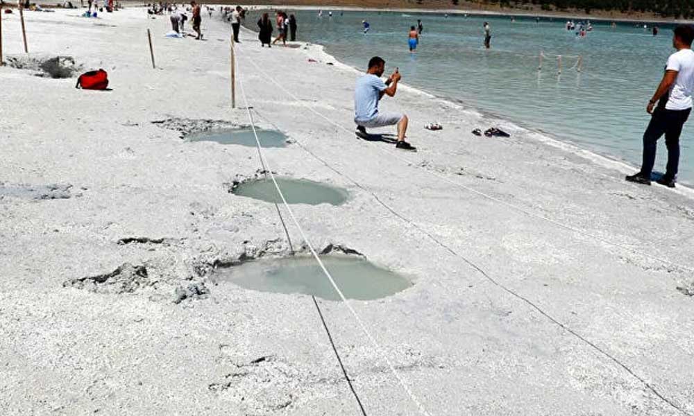 Salda Gölü'nde, sahildeki çamurun cilde iyi geldiğinin söylenmesi üzerine 'Beyaz adalar' bölümünde derin çukurlar oluşmaya başladı.