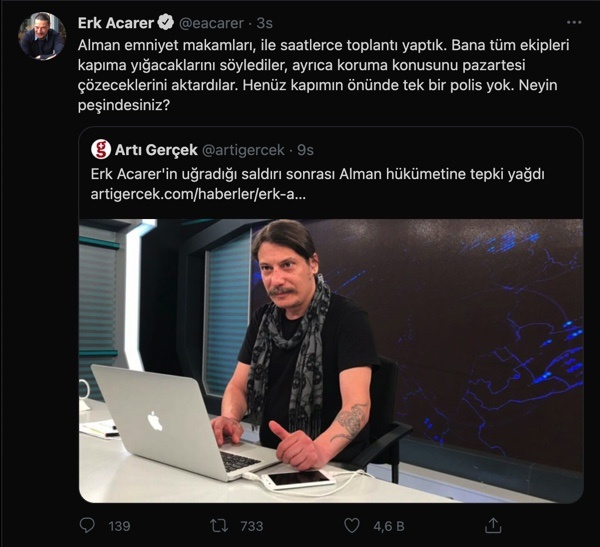 Tele1.com.tr ‘ye konuşan gazeteci Erk Acarer, birkaç haftadır tehdit telefonları aldığını söyledi. Fransa, İngiltere gibi ülkelerden de telefon ile aradığını belirten Acar, ‘Sana sandığından da çok yakınız’ diye tehditler aldığını ve bu saldırıları avukatları aracılığıyla Alman polisine bildirdiğini anlatmıştı.