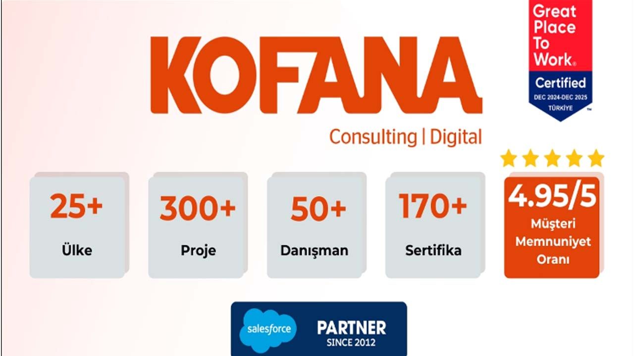 Kofana Digital, 2012 yılından bu yana 25’ten fazla ülkede 300’ün üzerinde şirkete büyük ölçekli dijital dönüşüm projelerinde danışmanlık hizmeti sunan, Salesforce’un Türkiye’deki ilk resmi iş ortağı ve EMEA bölgesinin en deneyimli teknoloji danışmanlık firmalarından biridir.