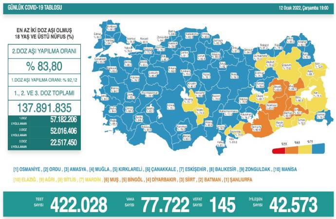 Türkiye'de 24 saatte 422 bin 28 kişi test oldu. Bunların 77 bin 722 bini pozitif çıkarken, 145 kişi ise koronavirüs nedeniyle hayatını kaybetti.