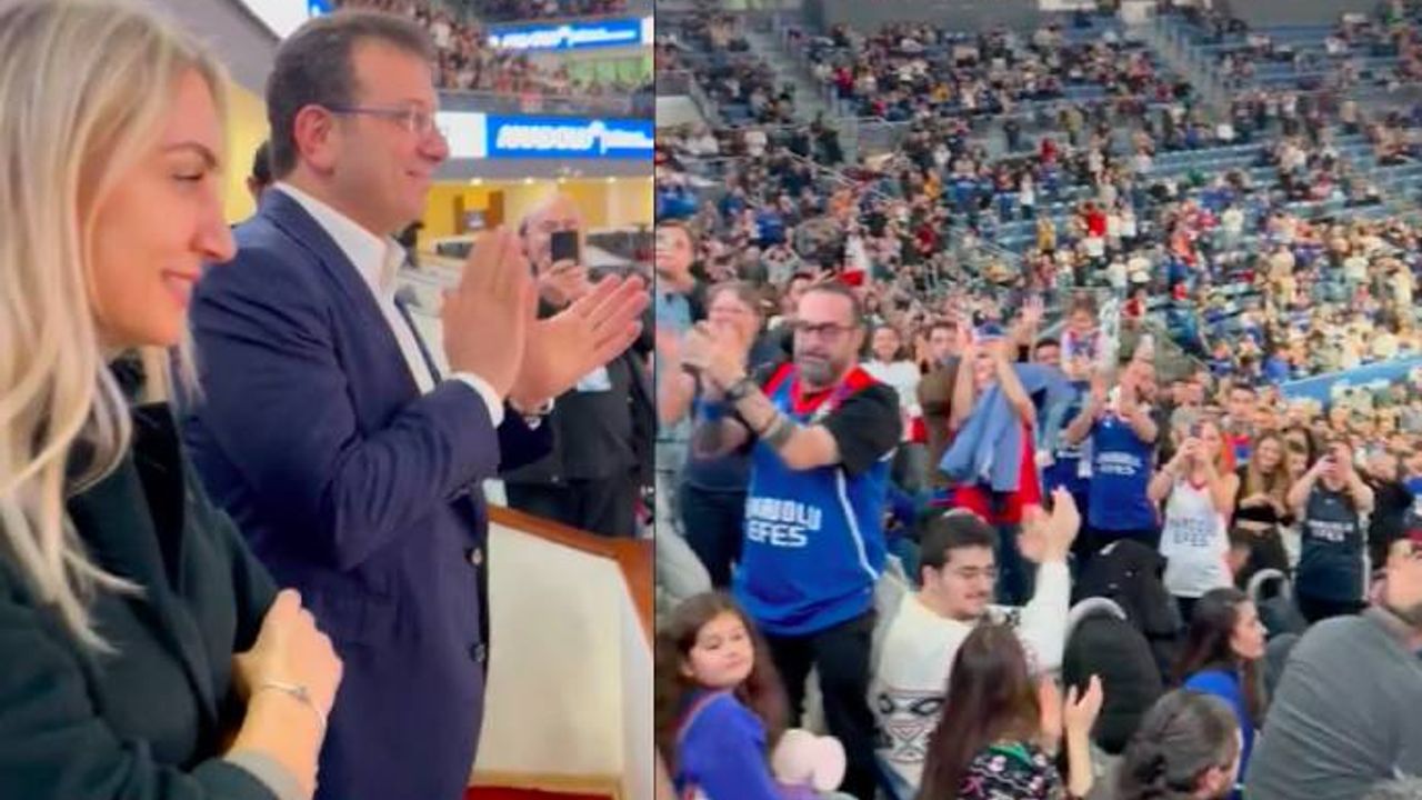 Saraçhane'de vatandaşlarla buluştuktan sonra eşi Dilek İmamoğlu ile birlikte Anadolu Efes-Baskonia karşılaşmasını izlemeye giden Ekrem İmamoğlu burada ayakta alkışlandı.