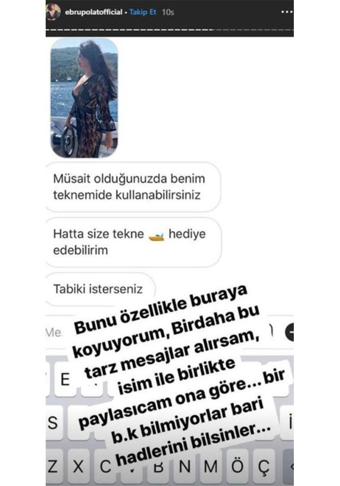 Sosyal medyayı aktif kullanan Ebru Polat, son olarak Instagram'da sürat teknesinde bir paylaşım yaptı. Şarkıcı, isim vermeden kendisine gelen çirkin bir mesajı ise ifşa etti. Bu tarz mesajlar gelmeye devam ederse isim de paylaşacağını vurgulayan Ebru Polat'a gelen mesajda, "Benim teknemi de kullanabilirsiniz; hatta size tekne hediye edebilirim" yazıyordu.'HADLERİNİ BİLSİNLER'