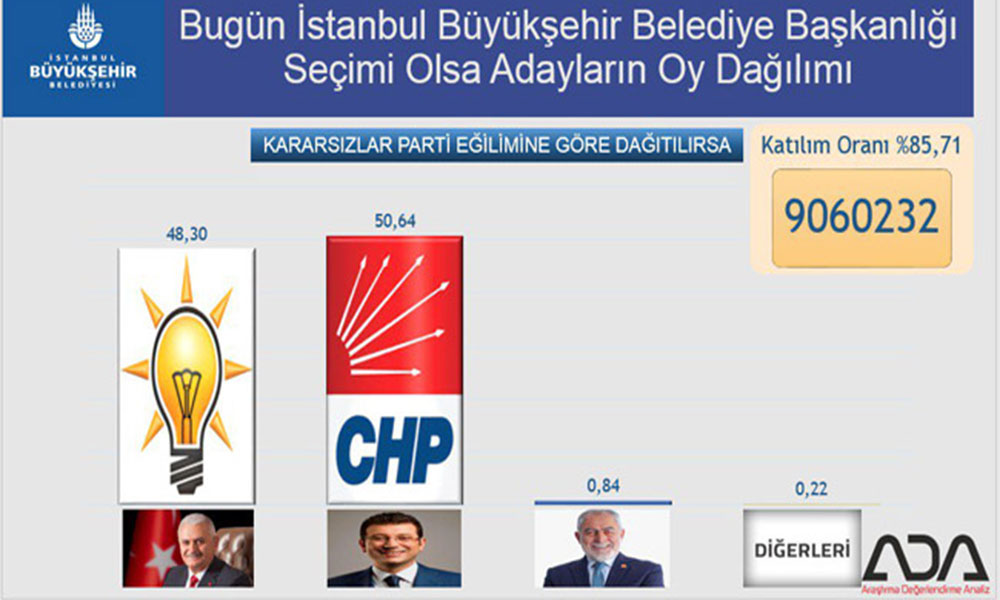 Seçime 1 hafta kala anket şirketlerinden araştırma sonuçları gelmeye devam ediyor. ADA Araştırma şirketi de, 23 Haziran'da tekrarlanacak İstanbul Büyükşehir Belediye Başkanlığı seçimleri için gerçekleştirdiği anketi paylaştı. Ankete göre Millet İttifakı adayı Ekrem İmamoğlu, seçim yarışını Cumhur İttifakı adayı Binali Yıldırım'ın önünde götürüyor.9 bin kişiyle yapılan ve "Bugün İstanbul'da seçim olsa hangi adaya oy verirdiniz?" sorusunun katılımcılara yöneltildiği ankette, kararsızların dağıtılması sonucunda Binali Yıldırım yüzde 48,30 destek alırken, Ekrem İmamoğlu yüzde 50,64'lük oranla öne geçti.Ankette Saadet Partisi adayı Necdet Gökçınar için destek yüzde 0,84 olarak belirlenirken, diğer adaylar için bu oran yüzde 0,22 seviyesinde kaldı. ADA Araştırma şirketi, 31 Mart seçimleri için İstanbul'da yaptığı ankette İmamoğlu'nun yüzde 49,2, Yıldırım'ın yüzde 48,4 oy alacağını öngörmüş, bu araştırmayla gerçek sonuçlara en çok yaklaşan anket şirketlerinden biri olmuştu.