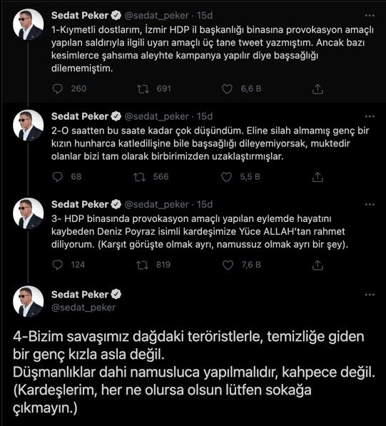 Suç örgütü lider Sedat Peker, HDP İzmir binasına saldırı düzenlenmesi sonucu hayatını kaybeden Deniz Poyraz için başsağlığı diledi.