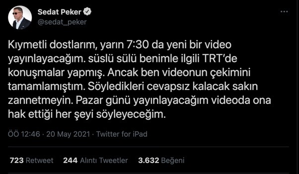 https://tele1.com.tr/soylu-sedat-pekerin-iddialarina-uluslararasi-bir-operasyon-dedi-394857/ Twitter hesabından yaptığı açıklamada Soylu'yu hedef alan Peker, "Söyledikleri cevapsız kalacak sakın zannetmeyin" ifadelerini kullanarak, "Kıymetli dostlarım, yarın 7:30 da yeni bir video yayınlayacağım. Süslü sülü benimle ilgili TRT’de konuşmalar yapmış. Ancak ben videonun çekimini tamamlamıştım. Söyledikleri cevapsız kalacak sakın zannetmeyin. Pazar günü yayınlayacağım videoda ona hak ettiği her şeyi söyleyeceğim."