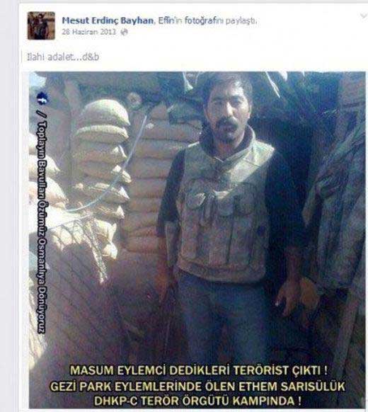 Savcı Bayhan ayrıca, Gezi Parkı eylemlerinde hayatını kaybeden Ethem Sarısülük’ün tabur komutanlığı inşaatında çekilen fotoğrafının terör örgütü kampında çekildiğini öne sürmüş, 28 Haziran 2013’teki paylaşımında Sarısülük’ün fotoğrafının üzerine “İlahi adalet” yazmıştı.