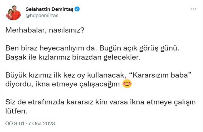 "Merhabalar, nasılsınız? Ben biraz heyecanlıyım da. Bugün açık görüş günü. Başak ile kızlarımız birazdan gelecekler. Büyük kızımız ilk kez oy kullanacak, 'Kararsızım baba' diyordu, ikna etmeye çalışacağım. Siz de etrafınızda kararsız kim varsa ikna etmeye çalışın lütfen."