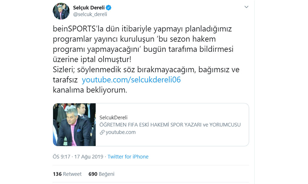 Eski hakem Selçuk Dereli'nin kendisine ait sosyal medya hesabından yaptığı paylaşımda '' beinSPORTS’la dün itibariyle yapmayı planladığımız programlar yayıncı kuruluşun ‘bu sezon hakem programı yapmayacağını’ bugün tarafıma bildirmesi üzerine iptal olmuştur! Sizleri; söylenmedik söz bırakmayacağım, bağımsız ve tarafsız https://youtube.com/selcukdereli06 kanalıma bekliyorum.'' ifadelerini kullandı. İşte o paylaşım: