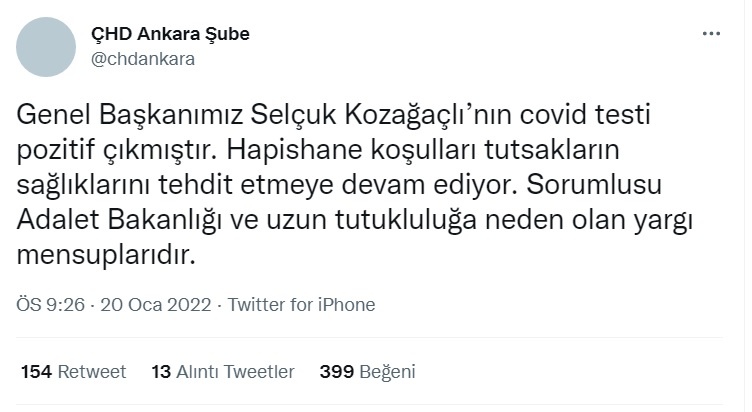 Ankara ÇHD'nin sosyal medya hesabından yapılan açıklamada, "Çağdaş Hukukçular Derneği Genel Başkanımız Selçuk Kozağaçlı’nın covid testi pozitif çıkmıştır. Hapishane koşulları tutsakların sağlıklarını tehdit etmeye devam ediyor. Sorumlusu Adalet Bakanlığı ve uzun tutukluluğa neden olan yargı mensuplarıdır" denildi.