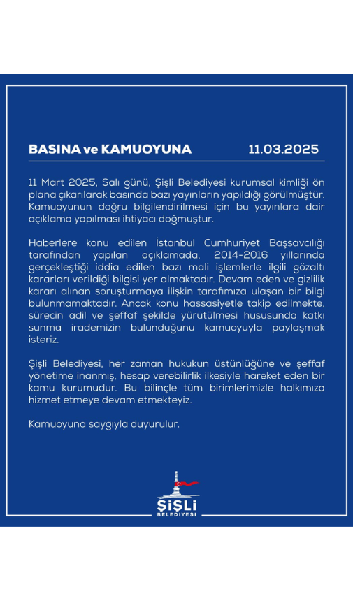 Şişli Belediyesi, haklarında başlatılan 'terör soruşturması' hakkında yaptıkları açıklamada, "Devam eden ve gizlilik kararı alınan soruşturmaya ilişkin tarafımıza ulaşan bir bilgi bulunmamaktadır" denildi.