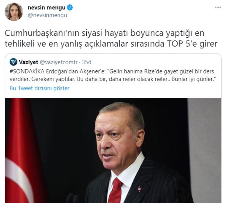 Twitter hesabından paylaşım yapan Mengü, Erdoğan'ın sözlerini eleştirdi.