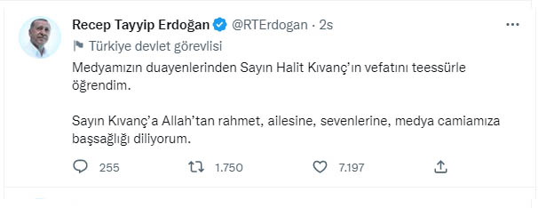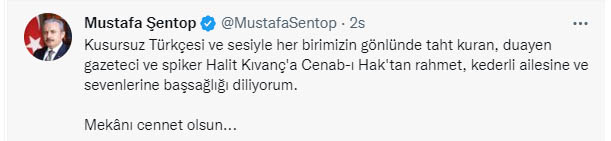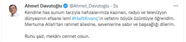 Gelecek Partisi Genel Başkanı Ahmet Davutoğlu "Kendine has sunum tarzıyla hafızalarımıza kazınan, radyo ve televizyon dünyasının efsane ismi #HalitKıvanç'ın vefatını büyük üzüntüyle öğrendim. Merhuma Allah'tan rahmet ailesine, sevenlerine sabır ve başsağlığı dilerim. Ruhu şad, mekânı cennet olsun." ifadelerini kullandı.