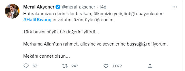 İYİ Parti Genel Başkanı Meral Akşener, Kıvanç'ın vefatından duyduğu üzüntüyü dile getiren bir mesaj yayımladı. Akşener, yaptığı paylaşımda, "Hatıralarımızda derin izler bırakan, ülkemizin yetiştirdiği duayenlerden Halit Kıvanç'ın vefatını üzüntüyle öğrendim. Türk basını büyük bir değerini yitirdi. Merhuma Allah'tan rahmet, ailesine ve sevenlerine başsağlığı diliyorum. Mekanı cennet olsun" dedi.