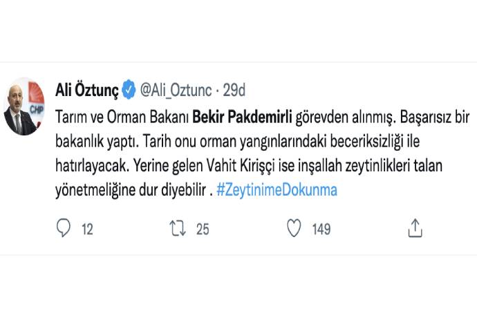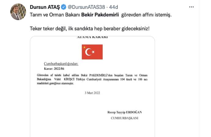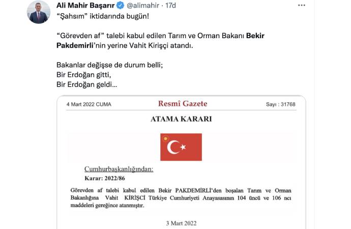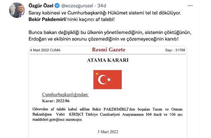 Resmi Gazete'de yayımlanan atama kararı ile Tarım ve Orman Bakanı Bekir Pakdemir'li 'görevden affını' istedi. Pakdemir'linin yerine ise Vahit Kirişçi atandı. Kabinedeki görev değişikliğine siyasetçiler tepki yağdırdı.