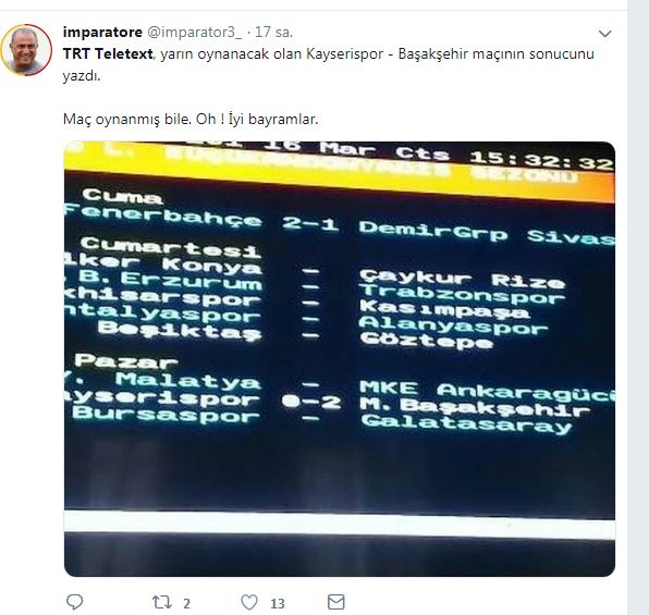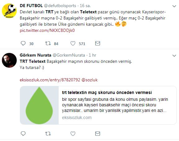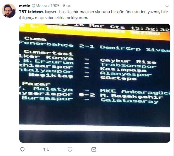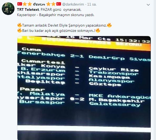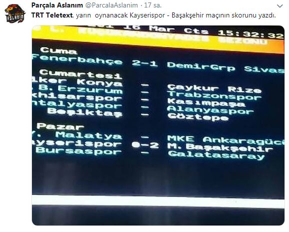 Sosyal Medya üzerinden paylaşılan görüntülerde TRT'nin Teletext ekranında Kayserispor - Başakşehirspor maçının skoru maçtan bir gün önce girildi. Teletext ekranına girenler Kayserispor