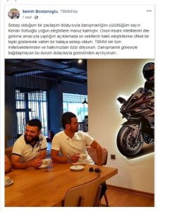 Semih Bostanoğlu bugün ise sosyal medya hesabından Kenan Sofuoğlu ile birlikte çekildiği bir fotoğrafını paylaşarak, danışmanlık görevinden ayrıldığını bildirdi. Bostanoğlu açıklamasında, "Sebep olduğum bir paylaşım dolayısıyla danışmanlığını yürüttüğüm Sayın Kenan Sofuoğlu yoğun eleştirilere maruz kalmıştır. O'nun insani niteliklerini dile getirme amacıyla yaptığım açıklamada sayın vekillerin haklı eleştirilerine öfkeli bir tepki göstererek, vahim bir hataya sebep oldum. TBMM'nin tüm milletvekillerinden ve halkımızdan özür diliyorum. Danışmanlık göreviyle bağdaşmayan bu durum dolayısıyla görevimden ayrılıyorum" dedi.