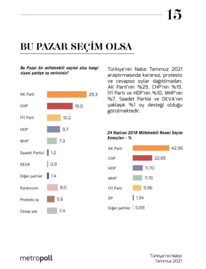 Ankete göre, kararsızlar dağıtılmadan AKP yüzde 29.3, CHP 19.0, İYİ Parti 10.2, HDP 9.7 ve MHP 7.3 oy oranına ulaşmış durumda. Ankette “kararsızım” diyenlerin yüzde 8 olarak ölçülürken, “cevap yok” diyenler 7.4, protesto oy kullananlar ise yüzde 5.6 çıktı. https://tele1.com.tr/ocak-ayi-anketinden-carpici-sonuc-cumhur-ittifaki-erimeye-devam-ediyor-324447/ Anket sonucunda, kararsızlar dağıtılsa bile yüzde 34’e ulaşabilen AKP’nin 24 Haziran 2018 seçimlerinde aldığı yüzde 42.56’lık oy oranından çok uzak olduğu görülüyor. Üstelik Özer Sencar anket sonuçlarını paylaşırken, “Bu araştırma Erdoğan’ın Diyarbakır seyahatinden sonra orman yangınları ve sel felaketlerinden önce yapılmıştır” notunu düşmesi de dikkat çekti.