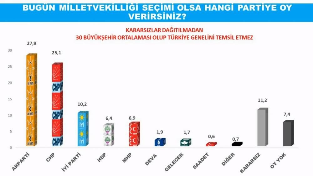 Kararsızlar dağıtıldığında ise CHP ve İYİ Parti'nin büyükşehirlerde oylarını yükseltirken Cumhur İttifakı'nın eridiği görüldü. Buna göre CHP'nin oyu yüzde 30.83, İYİ Parti'nin ise yüzde 12.53 oldu. AKP yüzde 34.27 oy alırken, MHP ise yüzde 8.47'de kaldı.
