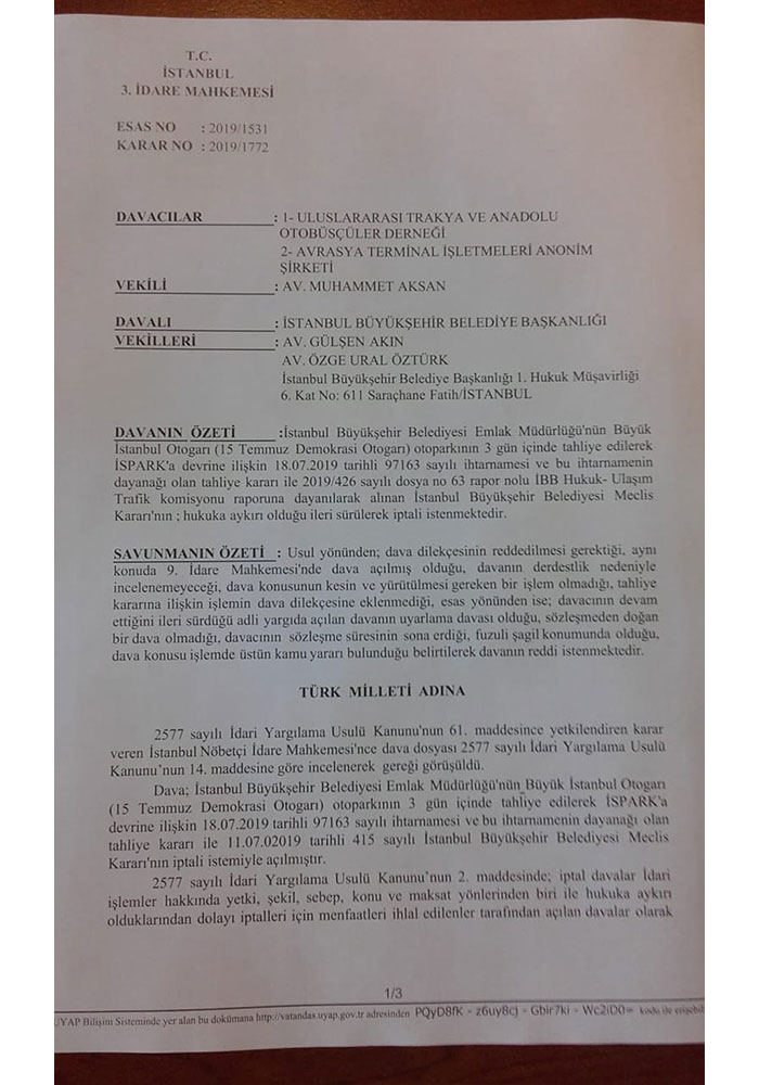 İstanbul 3. İdare Mahkemesi Uluslararası Trakya ve Anadolu Otobüsçüleri Derneği ve Avrasya Terminal İşletmeleri Anonim Şirketi tarafından İstanbul Büyükşehir Belediyesi aleyhine Esenler Otogarının Otopark kısmının İSPARK'a devrine karşı açılan davayı incelemeksizin reddine karar verdi.