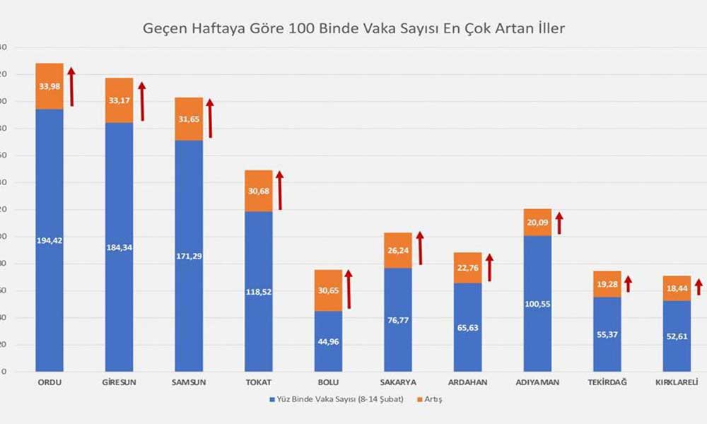 Sağlık Bakanı Fahrettin Koca, son bir haftada vaka sayısı en çok artan ve azalan illeri açıkladı. Buna göre; vakaların en çok azaldığı iller Bayburt, Erzincan, Trabzon, Karabük ve Hatay olarak sıralandı. En çok artış olan iller ise; Ordu, Giresun, Samsun, Tokat ve Bolu oldu. https://twitter.com/drfahrettinkoca/status/1365379571646881792 Koca, Twitter hesabından yaptığı paylaşımda son bir haftada, 100 bin nüfusta görülen vaka sayısı en çok artan ve azalan illeri paylaştı. Buna göre en çok vaka artışı Ordu'da. Ordu'yu sırasıyla; Giresun, Samsun, Tokat ve Bolu takip etti. Vaka sayısı en çok azalan il ise Bayburt. Bayburt'u Erzincan, Trabzon, Karabük ve Hatay takip etti.