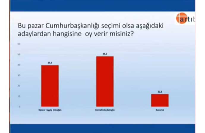 Artıbir araştırma şirketinin son seçim anketi sonuçlarına göre, Kemal Kılıçdaroğlu yüzde 48.2 oy alırken; Tayyip Erdoğan yüzde 39.7'de kaldı.