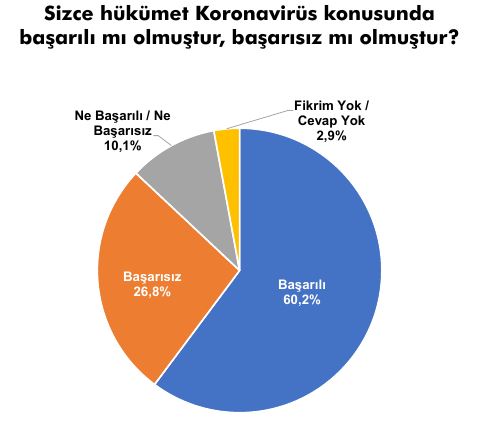 Yurttaşların, yüzde 60.2'si 'Sizce hükümet Koronavirüs konusunda başarılı mı olmuştur?'' sorusuna başarılı dedi.