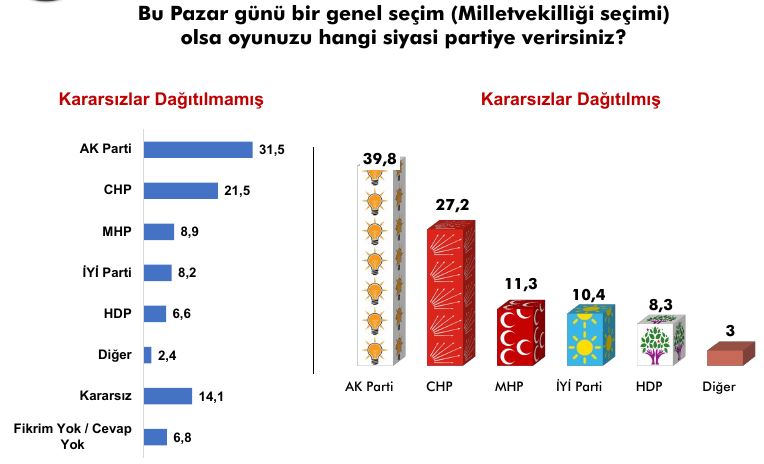 'Bu pazar günü Milletvekilliği seçimi olsa oyunuzu kime verirsiniz?' sorusuna yurttaşların yüzde 39.8'i AKP, yüzde 27.2'si CHP, yüzde 11.3'ü MHP, yüzde 10.4'ü İYİ Parti, yüzde 8.3'ü HDP, yüzde 3 ise diğer dedi.