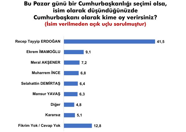 'Bu pazar günü cumhurbaşkanlığı seçimi olsa, isim olarak düşündüğünüzde oyunuzu kime verirsiniz?' sorusuna yurttaşların yüzde 41.5'i Erdoğan, yüzde 9.1'i İmamoğlu, yüzde 7.2'si 7.2, yüzde 6.8'i İnce, yüzde 6.4'ü Demirtaş, yüzde 6.3'ü Yavaş dedi.
