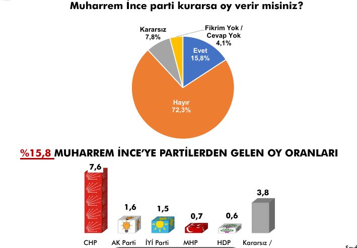 'Muharrem İnce parti kurarsa oy verir misiniz?' sorusuna yurttaşların yüzde 72.3'nün cevabı hayır oldu. Muharrem İnce'ye oy veririm diyen kişilerin yüzde 7.6'sı CHP, yüzde 1.6'sı AKP, yüzde 1.5'i İYİ Parti, yüzde 0.7'si MHP, yüzde 0.6'sı HDP seçmeni.