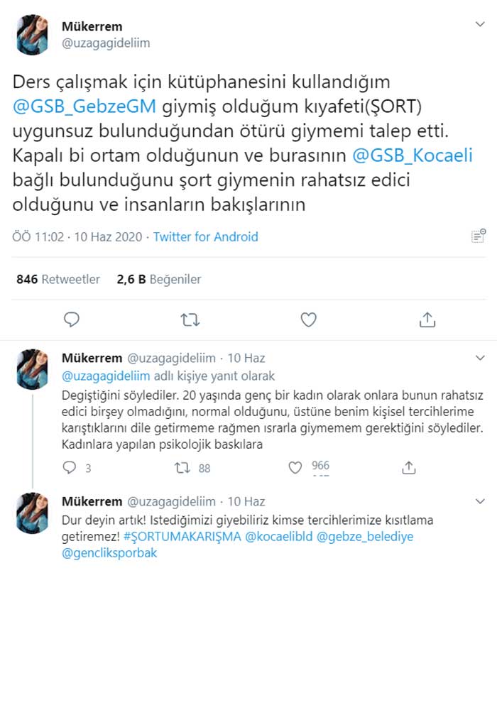 Gençlik ve Spor Bakanlığı’na bağlı Gebze Gençlik Merkezi’ne giden genç kadın şort giydiği gerekçesiyle kütüphaneye alınmadığını belirtti. Gerici muameleye maruz bırakılan genç kadın giydiği şortun 'uygunsuz bulunduğu' gerekçesiyle içeriye girmesine izin verilmediğini sosyal medya hesabından duyurdu. Twitter'dan açıklama yapan Mükerrem kullanıcı isimli kadın, "Ders çalışmak için kütüphanesini kullandığım @GSB_GebzeGM giymiş olduğum kıyafeti(ŞORT) uygunsuz bulunduğundan ötürü giymemi talep etti. Kapalı bi ortam olduğunun ve burasının @GSB_Kocaeli bağlı bulunduğunu şort giymenin rahatsız edici olduğunu ve insanların bakışlarının değiştiğini söylediler" diye yazdı.Genç kadın paylaşımlarının devamında şu ifadeleri kullandı:
