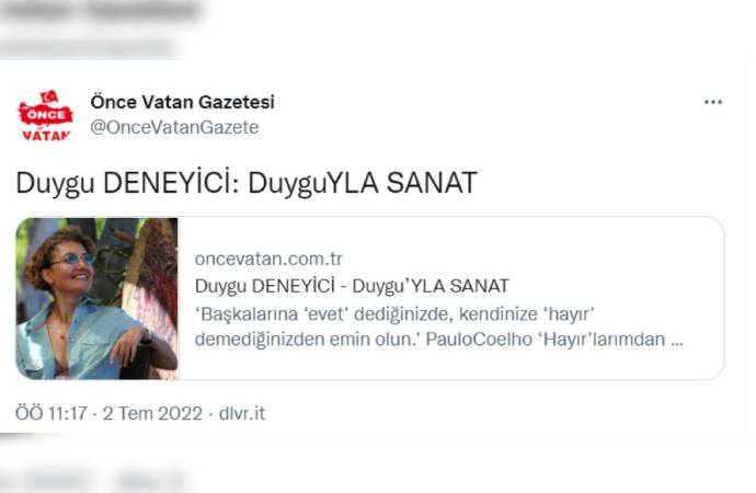 TELE 1'den Fırat Yeşilçınar'ın ulaştığı Önce Vatan Gazetesi, "Duygu Deneyici'nin bütün yazılarını kaldırdık. Artık yazarımız değil." dedi.