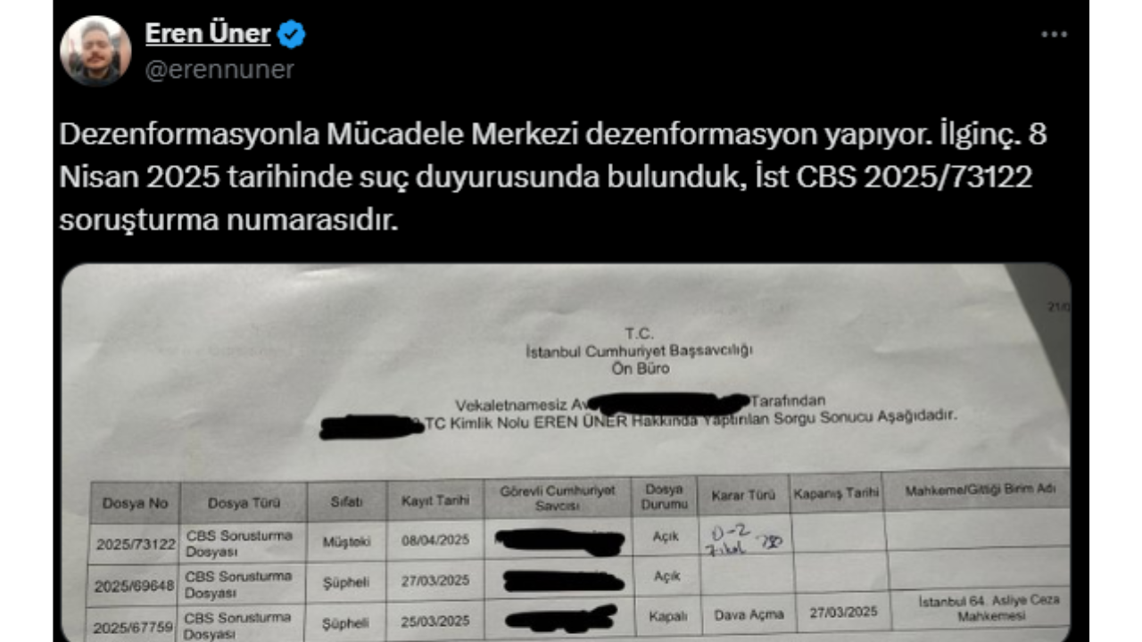 "Dezenformasyonla Mücadele Merkezi dezenformasyon yapıyor. İlginç. 8 Nisan 2025 tarihinde suç duyurusunda bulunduk, İst CBS 2025/73122 soruşturma numarasıdır."