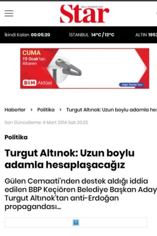 Star Gazetesi, AKP'nin Ankara adayı Turgut Altınok'u BBP'den aday olduğu dönemde hakkında FETÖ suçlamasında bulunduğu haberi apar topar sildi.
