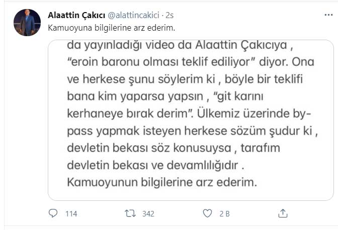 Organize suç örgütü lideri Alaattin Çakıcı, daha önce de birçok kez kendi imzasıyla mektuplar yayımladığı Twitter hesabından Kıbrıs'a kaçtığı ve kendisine 'eroin baronu olması teklif edildi' iddialarına yanıt verdi. Çakıcı, hangi ülkede olduğunu açıklamazken, uyuşturucu baronluğu teklifi geldiği iddiasını yalanladı.