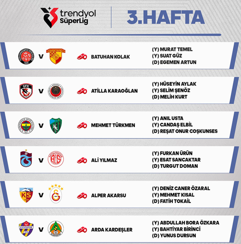 Türkiye Futbol Federasyonu (TFF) Trendyol Süper Lig'de 3. haftasında görev yapacak hakemleri açıkladı.