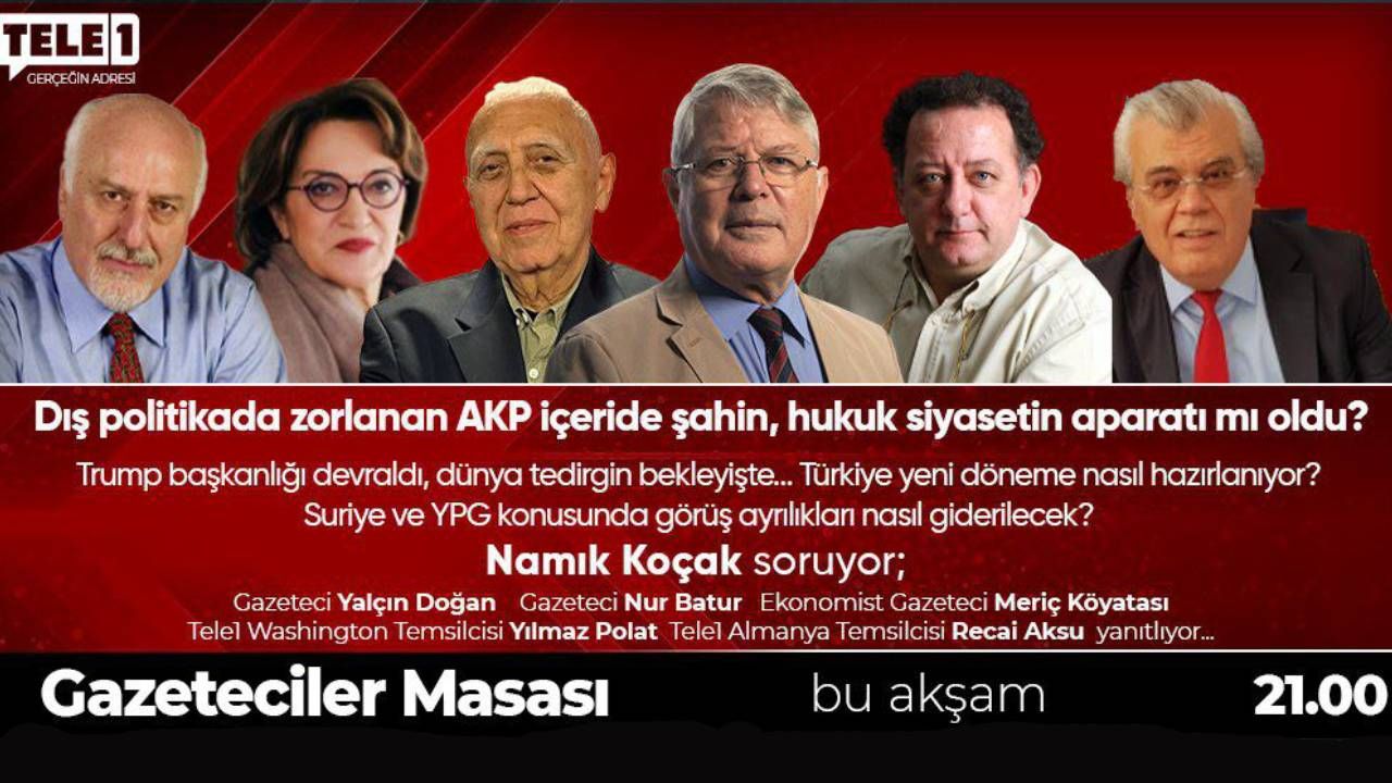Gazeteciler Masası programı, bu akşam saat 21.00 ila 23.50’de TELE1’de olacak.