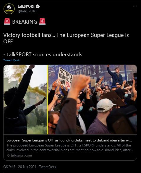 İngiliz merkezli spor gazetesi talkSPORT, Avrupa Süper Ligi'nin iptal edildiğini iddia etti.