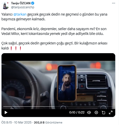 Özcan, Tarkan'ın şarkısına da yer verdiği paylaşımında, "Yalancı Tarkan geçcek geçcek dedin ne geçmesi o günden bu yana başımıza gelmeyen kalmadı. Pandemi, ekonomik kriz, depremler, seller daha sayayım mı? En son Vedat Milor, kent lokantasında yemek yedi diye adliyelik bile oldu.” dedi.