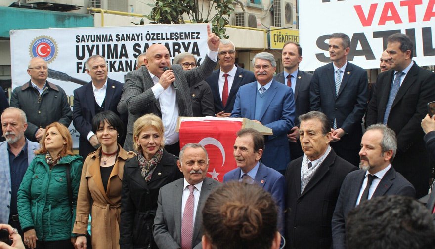 Tank Palet Fabrikası'nın özelleştirilmesine karşı düzenlenen eyleme CHP milletvekilleri Engin Özkoç, Fikri Sağlar, Deniz Yavuzyılmaz, Ünal Demirtaş ve Haydar Akar ile İYİ Parti milletvekili Ümit Dikbayır katıldı.[/caption]