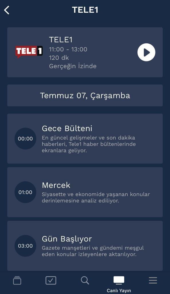 Gerçek habere ulaşmak artık daha kolay. TELE1'in tüm programları, canlı yayınları artık televizyonla eş zamanlı olarak BluTV'de. TELE1 TV Frekans, platfrom numaralarına ve resmi kanallara aşağıda ulaşabilirsiniz. D-Smart: 273. kanal Digitürk: 48. kanal Türksat: 4A 12034 v 27500 Digiturk: 48. kanal D-Smart: 273. kanal Resmi Facebook sayfası: https://www.facebook.com/tele1comtr Resmi Twitter Hesabı: https://twitter.com/tele1comtr Resmi Instagram Hesabı: www.instagram.com/tvtele1/ Resmi Youtube Kanalı: https://www.youtube.com/c/Tele1comtr/featured Resmi Resmi Telegram Kanalı: https://t.me/tele1haberler