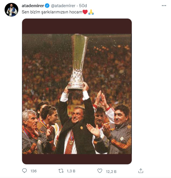 Son olarak Giresunspor karşısında alınan yenilginin ardından olağanüstü durum ilan edilen Galatasaray'da, Fatih Terim ile yollar ayrıldı. Başkan Burak Elmas ile Teknik Direktör Fatih Terim, Nef Stadyumu'nda görüşme gerçekleştirdi. 15 dakika süren toplantıda durum değerlendirmesi yapıldıktan sonra ayrılık kararı çıktı. Terim, ayrılık kararının ardından Florya Metin Oktay Tesisleri’ne giderek eşyalarını topladı ve hem futbolcular hem de çalışanlarla vedalaştı. Terim'in ayrılığı, sosyal medyada adeta deprem etkisi yarattı. #FatihTerim etiketi, Twitter gündeminde 1. sıraya yükseldi. Galatasaray taraftarı, ünlü teknik adamla ilgili art arda paylaşımlarda bulundu. Sosyal medyadaki Terim depremi sürerken; konuya ilişkin bir paylaşım da Galatasaraylılığı ile bilinen ünlü komedyen Ata Demirer'den geldi. Twitter'dan, Terim'in UEFA Kupası'nı kaldırdığı bir anın fotoğrafını paylaşan Demirer, gönderiye "Sen bizim şarkılarımızsın hocam" notunu düştü. https://tele1.com.tr/fatih-terim-ile-galatasarayin-yollari-ayrildi-542131/ Ünlü komedyenin paylaşımı şu şekilde:
