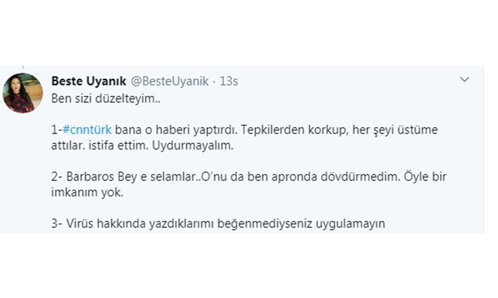 Uyanık, "#cnntürk bana o haberi yaptırdı. Tepkilerden korkup, her şeyi üstüme attılar. İstifa ettim. Uydurmayalım. Virüs hakkında yazdıklarımı beğenmediyseniz uygulamayın" ifadelerini kullandı.