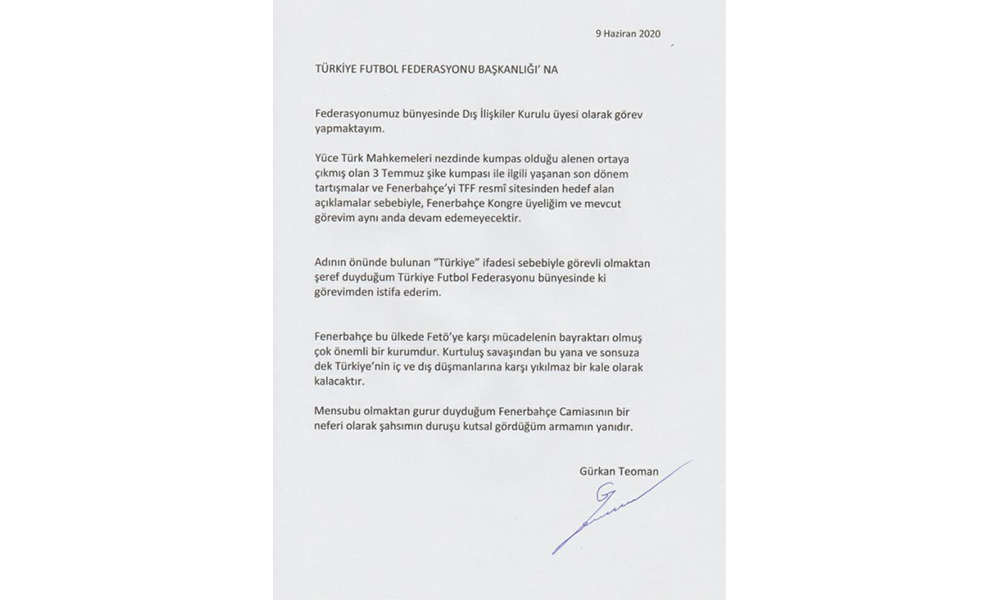 Türkiye Futbol Federasyonu Dış İlişkiler İcra Kurulu Üyesi Gürkan Teoman, TFF başkanı Nihat Özdemir'in yaptığı açıklamalar nedeniyle görevinden ayrılma kararı aldığını açıkladı. Geçtiğimiz günlerde Gürkan Teoman, "Fenerbahçe Ceketi" diye tabir edilen şanlı Fenerbahçe Sancağı bizim kefenimizdir. Güçlü organizasyonların deneme kabininde türlü türlü ceket değiştirenlerle yolumuz da ülkümüz de bir değildir' şeklinde bir tweet atmıştı Gürkan Teoman'ın dilekçesi şu şekilde;