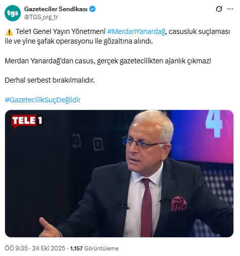 Türkiye Gazeteciler Sendikası (TGS), TELE1 Genel Yayın Yönetmeni Merdan Yanardağ'ın sabah saatlerinde gözaltına alınmasına tepki gösterdi.