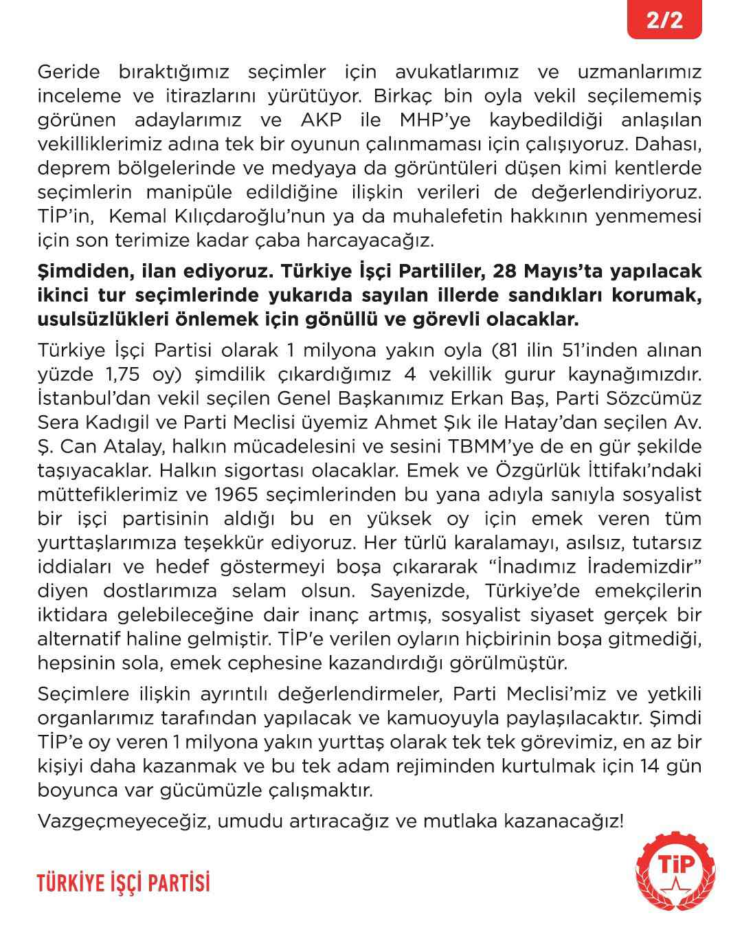 TİP, gelen eleştiriler üzerine Twitter hesabından açıkama yaptı. Parti, Millet İttifakı'nın Cumhurbaşkanı adayı Kemal Kılıçdaroğlu'nun ikinci turda seçilmesi için mücadele edeceklerini belirtti. Partinin açıklaması şöyle: "iNATÇIYIZ UMUTLUYUZ! Türkiye tarihinin en önemli seçimlerinden biri geride kaldı. Devletin tüm olanaklarını kullanan, kendisine muhalif tüm kesimleri düşman ve terörist ilan eden AKP-MHP ittifakını şimdilik koltuktan indirememenin öfkesini ve üzüntüsünü yaşıyoruz. Halkın yarısından fazlasının, her türlü tehdit ve hileye rağmen Saray'a onay vermemiş olması ise umudumuzun kaynağıdır. Yoksullaştırılan emekçilere, şiddete karşı yalnız bırakılan kadınlara, ülke için hayaller kurması engellenen gençlere karşı bir borcumuz olduğunu biliyoruz. Biz inatçıyız. İnadımızı, ülkemiz ve halkımız için güzel günlere olan inancımız besliyor. Bu inancı hiçbir gücün elimizden alamayacağını 15 Mayıs 2023'te bir kez daha ilan ediyoruz. Gün, bir kez daha ayağa kalkma günüdür. Gün, iktidarı yenebileceğimizi birbirimize anlatma günüdür. Gün, yüz yıl önce Saray'a boyun eğmeyen tarihimizden ilham alma günüdür. Türkiye İşçi Partisi olarak, 28 Mayıs günü yapılacak Cumhurbaşkanlığı 2. Tur seçimlerinde, Kemal Kılıçdaroğlu'nun kazanması ve Tayyip Erdoğan'ın kaybetmesi için üzerimize düşen sorumluluğu yapacağımızı duyuruyoruz. Onbinlerce üyemiz, 1 milyona yaklaşan seçmeniz adına halkımıza "Sana Söz" diyoruz... 14 Mayıs öncesinde TİP üyeleri nasıl arı gibi çalıştıysa, yaratıcı emekleriyle gönüllülerimiz nasıl çaba harcadıysa, aynı heyecan ve coşkuyu 14 gün boyunca da Kılıçdaroğlu için göreceksiniz. Geride bıraktığımız seçimler için avukatlarımız ve uzmanlarımız inceleme ve itirazlarını yürütüyor. Birkaç bin oyla vekil seçilememiş görünen adaylarımız ve AKP ile MHP'ye kaybedildiği anlaşılan vekilliklerimiz adına tek bir oyunun çalınmaması için çalışıyoruz. Dahası, deprem bölgelerinde ve medyaya da görüntüleri düşen kimi kentlerde seçimlerin manipüle edildiğine ilişkin verileri de değerlendiriyoruz. TİP'in, Kemal Kılıçdaroğlu'nun ya da muhalefetin hakkının yenmemesi için son terimize kadar çaba harcayacağız. Şimdiden, ilan ediyoruz. Türkiye İşçi Partililer, 28 Mayıs'ta yapılacak ikinci tur seçimlerinde yukarıda sayılan illerde sandıkları korumak, usulsüzlükleri önlemek için gönüllü ve görevli olacaklar. Türkiye İşçi Partisi olarak 1 milyona yakın oyla (81 ilin 51'inden alınan yüzde 1,75 oy) şimdilik çıkardığımız 4 vekillik gurur kaynağımızdır. İstanbul'dan vekil seçilen Genel Başkanımız Erkan Baş, Parti Sözcümüz Sera Kadıgil ve Parti Meclisi üyemiz Ahmet Şık ile Hatay'dan seçilen Av. Ş. Can Atalay, halkın mücadelesini ve sesini TBMM'ye de en gür şekilde taşıyacaklar. Halkın sigortası olacaklar. Emek ve Özgürlük İttifakı'ndaki müttefiklerimiz ve 1965 seçimlerinden bu yana adıyla sanıyla sosyalist bir işçi partisinin aldığı bu en yüksek oy için emek veren tüm yurttaşlarımıza teşekkür ediyoruz. Her türlü karalamayı, asılsız, tutarsız iddiaları ve hedef göstermeyi boşa çıkararak "İnadımız İrademizdir" diyen dostlarımıza selam olsun. Sayenizde, Türkiye'de emekçilerin iktidara gelebileceğine dair inanç artmış, sosyalist siyaset gerçek bir alternatif haline gelmiştir. TİP'e verilen oyların hiçbirinin boşa gitmediği, hepsinin sola, emek cephesine kazandırdığı görülmüştür. Seçimlere ilişkin ayrıntılı değerlendirmeler, Parti Meclisi'miz ve yetkili organlarımız tarafından yapılacak ve kamuoyuyla paylaşılacaktır. Şimdi TİP'e oy veren 1 milyona yakın yurttaş olarak tek tek görevimiz, en az bir kişiyi daha kazanmak ve bu tek adam rejiminden kurtulmak için 14 gün boyunca var gücümüzle çalışmaktır. Vazgeçmeyeceğiz, umudu artıracağız ve mutlaka kazanacağız!"